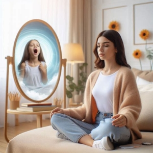 Une femme en hypnose retrouve son enfant intérieur, atmosphère lumineuse et réparatrice, confiance et sérénité